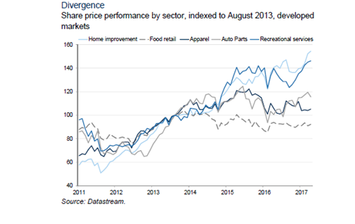 零售商大批破產(chǎn)的同時(shí),一些對(duì)電商“免疫”的行業(yè),在過去幾年表現(xiàn)卻明顯優(yōu)于其他消費(fèi)類行業(yè)。高盛在一篇報(bào)告中總結(jié)了以下四類:1、線下體驗(yàn)型消費(fèi)(如游樂場(chǎng));2、“大件”商品和服務(wù)(如家具、教育);3、B2B類商品(如工業(yè)零件);4、有監(jiān)管約束的商品(如藥品)。