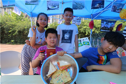 不要以為拿著護照,在校園里隨意的蹭吃蹭喝蹭表演看,這個國際周就算圓滿了。一帶一路“自助游”的路線是這樣的:首先要在教室里,認真學習和了解“一帶一路”沿線國家的靜態文化展示;接著去操場和報告廳體驗國家的動態文化展示——美食、舞蹈、音樂等民俗文化;最后去簽證官處“面簽”,想要拿到簽證絕非易事,還得回答“簽證官”提問的問題,如“看我們的國旗,我們是哪個國家的?”“我們國家什么最著名呀?”等問題,而問題的答案,都在孩子們精心準備的文化展板里。如果你被簽證官“拒簽”,那么請你再去學習深造一下。你瞧,孩子們可不覺得這是一場游戲,而是把這看出是一堂課程、一次學習,一次檢驗自己知識儲備的考試。當孩子們集齊所有國家的簽證,那么學校會有神秘的兒童節禮物獎勵你。