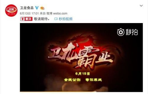 6月14日消息,衛龍辣條也要跨界出手游了。衛龍食品官微曝光了一則預告短片,表示將于6月15日公測一款名叫《衛龍霸業》的手游。