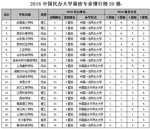 在最新2016中國各地區大學最佳專業排行榜中,北京市高校有74專業榮膺中國七星級專業,蟬聯第1,上海列第2,江蘇居第3,湖北列第4,湖南居第5。在2016中國民辦大學最佳專業排行榜中,武昌首義學院、文華學院、西安外事學院、山東英才學院和西安歐亞學院名列前5強。在2016中國獨立學院最佳專業排行榜中,吉林大學珠海學院、四川大學錦江學院、北京師范大學珠海分校、河南理工大學萬方科技學院和云南師范大學商學院名列前5強。