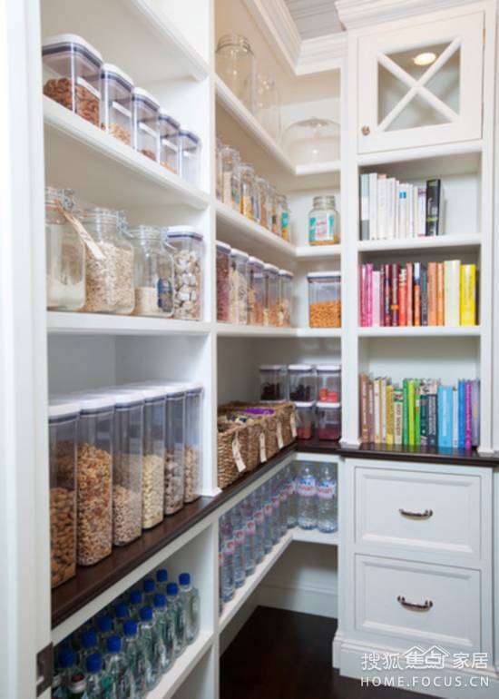 對于一個廚房,儲藏室面積是非常寶貴的,這里的貨架是原料的完美收納空間。瓶瓶罐罐全部擺放整齊,保持區域整潔,增加了廚房的樂趣。