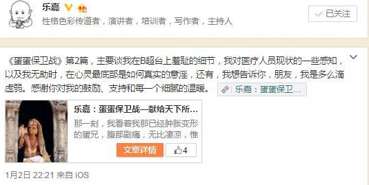 樂嘉在文中不僅敘述了傷后2次就醫照B超的過程,以及對醫療人員現狀的一些感知,還在文中自我安慰稱“我開始想我的丫頭靈兒,嗯,還好,樂門有后啦;我開始想40歲時幸好做了精子冷凍”。