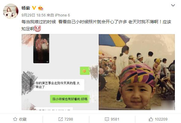 9月29日,楊紫曬出兩張照片,一張為聊天的截圖,一張為楊紫小時(shí)候的照片,楊紫寫道:“每當(dāng)我難過的時(shí)候,看看自己小時(shí)候照片就會(huì)開心了許多。老天對(duì)我不薄啊!應(yīng)該知足啊。”