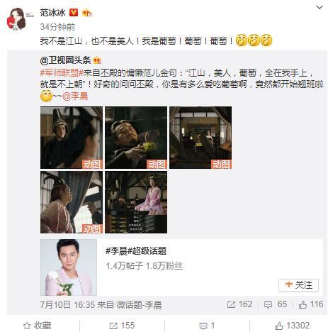 范冰冰看到后,轉發這條微博,還稱自己不是江山、也不是美人,只是一顆葡萄,緊接著一連四個感嘆號,把自己比作李晨愛吃的葡萄,不少網友看到覺得驚呆了,范爺也變得有點污。