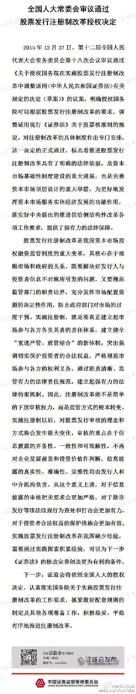 證監會官方微博27日傍晚發布信息,稱全國人大常委會審議通過股票發行注冊制改革授權決定,下一步,證監會將積極穩妥、平穩有序地推進注冊制改革。