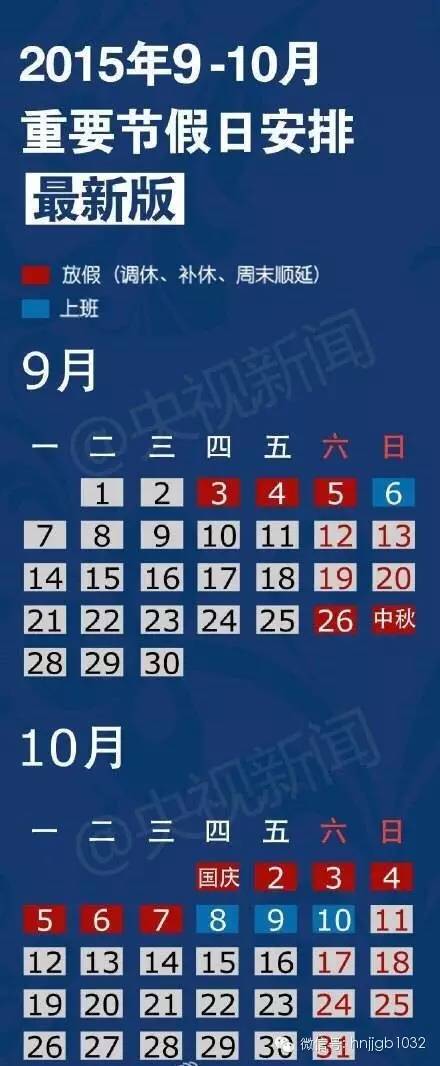 今年國慶節(jié)10月1日至7日放假調(diào)休,共7天;10月10日(星期六)上班,10月11日周日正常休假。這實(shí)際是把中秋節(jié)的補(bǔ)假放在了國慶節(jié)一起安排,避免了連續(xù)9天上班。