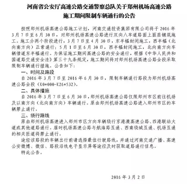 自2016年3月7日至6月30日,鄭州機場高速公路僅限鄭州市區前往機場及以南方向(北向南方向)車輛通行。原由鄭州機場高速公路進入鄭州市區的車輛禁止通行。