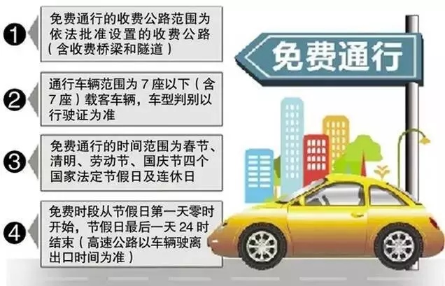 根據《重大節假日免收小型客車通行費實施方案》,高速公路免費通行的的具體政策如下:(一)免費通行的時間范圍為春節、清明節、勞動節、國慶節等四個國家法定節假日,以及當年國務院辦公廳文件確定的上述法定節假日連休日。免費時段從節假日第一天00:00開始,節假日最后一天24:00結束(普通公路以車輛通過收費站收費車道的時間為準,高速公路以車輛駛離出口收費車道的時間為準)。