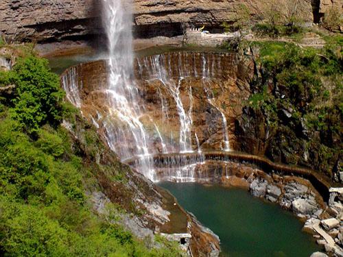 紅石河碧水橫溢、紅綠相映、色彩斑斕、明麗如畫,因海拔1100米被譽為“太行天河”。從紅石河畔俯瞰,山谷幽深、流水潺潺,河水順著光潔平整、錯落有致的紅石板流淌不息,直沖而下形成又一著名景點——天河大瀑布。紅石河的右畔是觀音洞,觀音洞里的泉水常年不斷、甘甜可口,用來泡茶增三分香,煮飯增加三分甜,現在敞開供應,保你一杯解風塵,二杯去疲乏,三杯大汗落。 八里溝的山,八里溝的水,甚至八里溝的每一塊石頭都引起世界的好奇。景區森林覆蓋率達90%,如今,八里溝景區已經成為國內很多前衛、時尚的游客非常向往的一個人間天堂、世外桃源,也是春季旅游的經典線路。