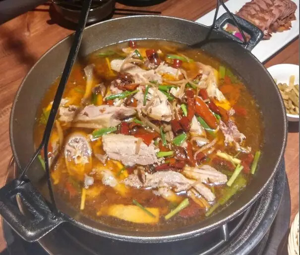 這鍋也不是普通鍋,必是生鐵的才好,一是厚重,鍋不會亂動,二是健康,補鐵補血,比廣告強。鍋內放信陽老燉菜,老公雞、排骨、豬蹄、鵝塊,時間越久越有味。如果是冬天,“新醅酒,小火爐,天欲雪,一杯無”意境太贊,要是夏天,“炭火燒,大汗淌,赤膊上,可勁浪”,警察叔叔也管不著~~