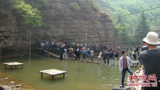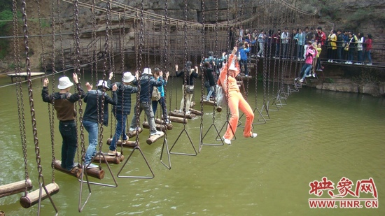 盡管鄭州的天氣忽冷忽熱還時不時的狂風大作,但是在這里天氣卻晴朗明媚,溫度也正好適宜外出游玩。當然,玩的嗨才是最關鍵的!景區內除了誰都不會錯過的風景名勝外還有很多有趣的娛樂項目:比如過吊索:看起來簡單的吊索其實需要有很好的體力和身體協調力,一不留神就可能狼狽的掉入半米深的池水中。還有劃沖鋒舟,非??简瀳F隊的協作。不過最好玩的卻是在大巴車上,“樂活”的工作人員們把最自己具特色的電臺節目“知道不知道”搬上了大巴車,并邀請了電臺的明星主持亞楠來與大家互動,把無聊的旅途變得趣味橫生。