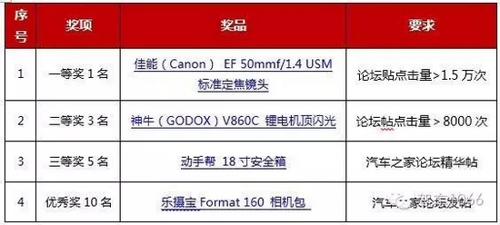 為了滿足眾多攝影愛好者和車迷們的拍攝需求,中原國際車展聯合攝影愛好者協會共同舉辦“中原國際車展汽車攝影大賽”。只要你愛車、喜歡拍照,就可以報名參賽!此外,在汽車之家發布論壇帖可以獲得大獎喲~