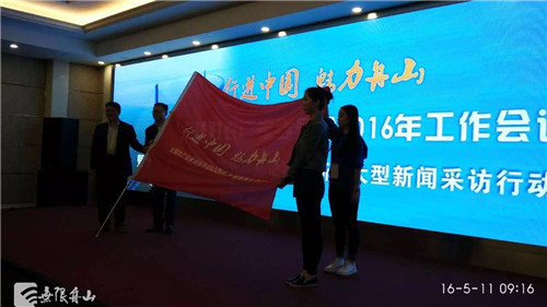 中廣聯對農廣播委員會會長史敏、舟山市委常委、宣傳部部長、統戰部部長忻海平為“行進中國 魅力舟山”全國農村廣播記者走進舟山大型新聞采訪行動授旗。中央人民廣播電臺記者劉旻嚖、舟山新聞廣播記者沈宇曄接旗。