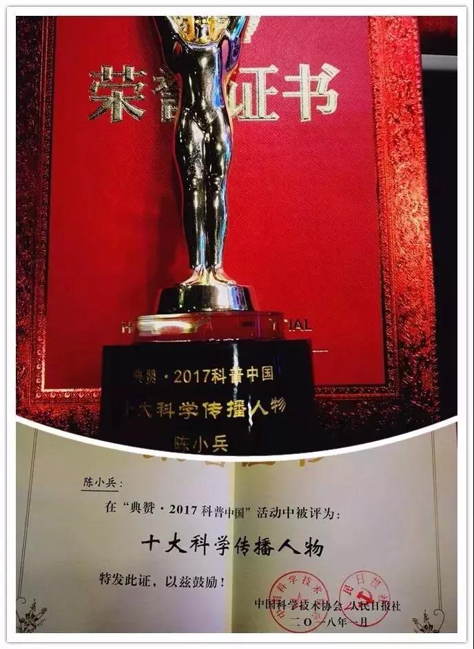 陳小兵當選“2017年十大科學傳播人物”,組委會給予他的頒獎詞是,在緊張的臨床工作之余,他熱心醫學科普,下基層、走街道、進校園、入社區,腳步走遍中原,做科普講座300余場,受眾十余萬人,積極推廣“預防為主”的防癌理念,為腫瘤科普殫精竭慮,被譽為“中原腫瘤科普第一人”。