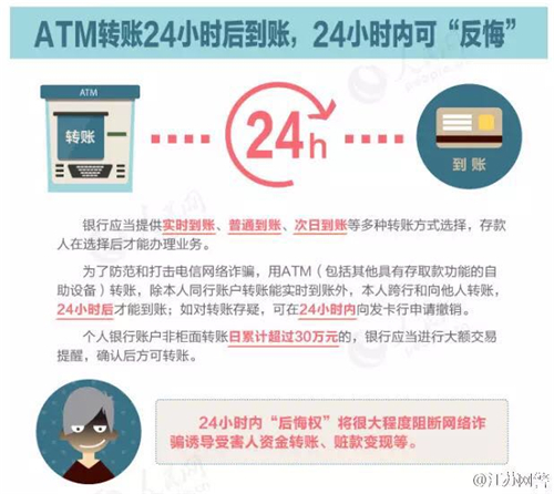 12月1日起,一批銀行新規開始實行,其中最引人矚目的一條,則是通過ATM機轉賬,由原來的實時到賬改為默認24小時后到賬,24小時內可撤銷轉賬操作,這等于給消費者提供了一粒“后悔藥”,也能從一定程度上防止電信詐騙。