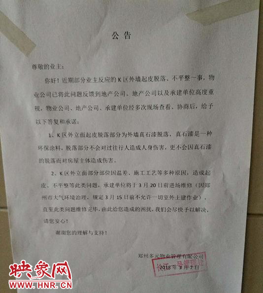 不過,發稿前,“大象幫辦”記者接到了該小區物業的最新消息:為消除業主的顧慮,他們已在小區單元門口張貼公告,向業主解釋了外立面凸起產生原因,并承諾承建單位工程部將組織維修人員在3月20日之前進場維修,直至此類問題維修完畢。