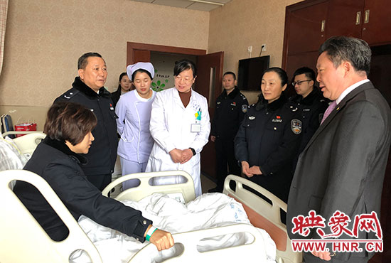 鄭東分局局長(zhǎng)張予西等領(lǐng)導(dǎo)同志看望在病床上的宋穎穎