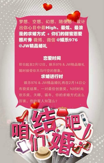 2月12日娛樂976全新上線,我們為您打造一場廣播史上最時尚最浪漫的求婚派對+結婚盛典!只要心中有愛,求婚方式可以多姿多彩,怎樣的求婚才能讓她難忘、心甘情愿說“I do!”?現在,只要有創意的求婚方式,就可以獲得10萬元求婚+結婚盛典!求婚,你準備好了嗎?咱們結婚吧!