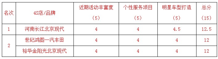 河南長江北京現代、世紀鴻圖一汽豐田、裕華金陽光北京現代 分列【紅榜】1,2,3名!
