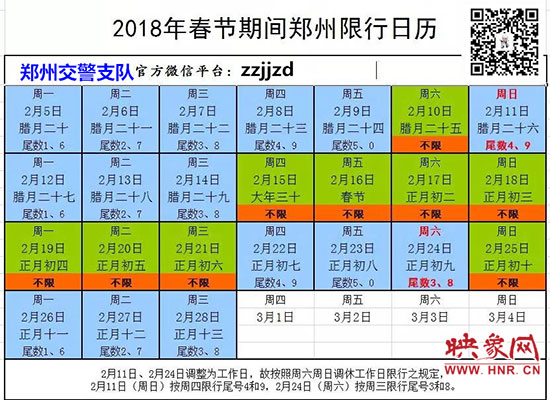 映象網訊(記者 秦雯)2018年春節長假從2月15日開始至2月21日結束,共7天,春節將至,為了確保在市民人流、車流、物流最密集的時段可以安全出行。2月5日,記者從鄭州市交警支隊了解到:2月15日至2月21日春節七天長假期間,鄭州市區三環以內所有機動車尾號不限行,但2月11日(星期日)、2月24日(星期六)上班,因法定節假日放假調休而調整為上班的周六、周日,按對應調休的工作日限行,因此2月11日(周日)按周四限行規定,限行尾號4和9;2月24日(周六)按周三限行規定,限行尾號3和8。