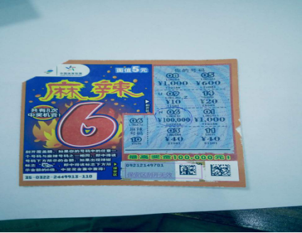 “麻辣6”玩法簡單。刮開覆蓋膜,如果你的號碼中的任意一個號碼與中獎號碼之一相同,即中得該號碼下方所示的金額;如果出現(xiàn)辣椒標(biāo)志,即中得該標(biāo)志下方所示金額的6倍。獎金兼中兼得。(李棟)