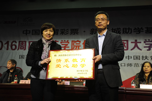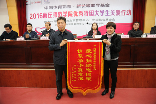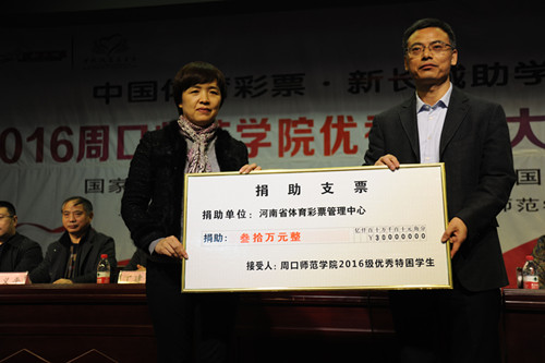 2016年12月7日、8日,中國體育彩票品牌公益項目“中國體育彩票新長城助學基金”2016年捐贈儀式分別在商丘師范學院和周口師范學院舉行。據悉,通過此次捐贈活動,河南省體育彩票管理中心共向兩個學校來自全國14省區的120名優秀貧困大學生每人捐助5000元,幫助他們和他們的家庭,減輕學習生活中的經濟負擔。