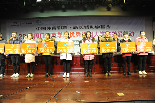 在周口師范學院捐贈儀式上,河南省體育彩票管理中心書記王海新告訴記者,今年新長城助學與前三年相比,受捐助學校的規模擴大了,捐助的總金額增加了,每位受捐助學生的受助金額也提高了。首先是今年受助學校由之前的每年1所擴大為2所。在今年受贈學校的選擇上,以河南省欠發達的豫東地區作為目標捐助地區,經過調研,最終確定了商丘師范學院和周口師范學院2所學校作為今年的捐贈學校。第二個不同就是受捐助的學生由前年的50人,增加到去年的60人,再增加到今年的120人。第三個不同就是受捐助學生拿到的捐助款越來越多了,由之前的每人 4000元增加到今年的每人5000元。