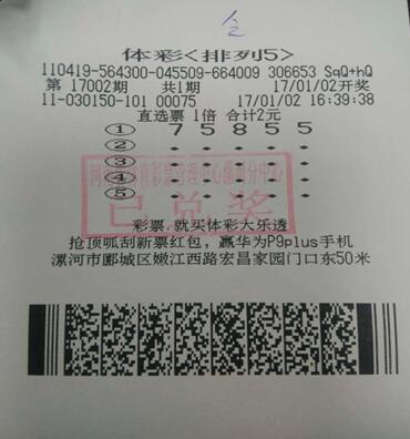 1月2日晚,第17002期排列五開獎,開獎號碼是“75855”,漯河彩民喜中10萬元大獎1注,這也是當地2017年第1注排列五大獎。