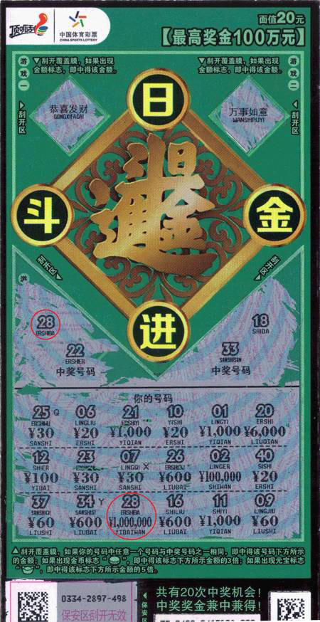 “日進斗金”面值20元,共有三個游戲。游戲一和游戲二,刮開覆蓋膜,如果出現金額標志,即中得該金額;游戲三:刮開覆蓋膜,如果你的號碼中任意一個號碼與中獎號碼之一相同,即中得該號碼下方所示的金額;如果出現銅錢標志,即中得該標志下方所示金額的3倍;如果出現元寶標志,即中得該標志下方所示金額的5倍。