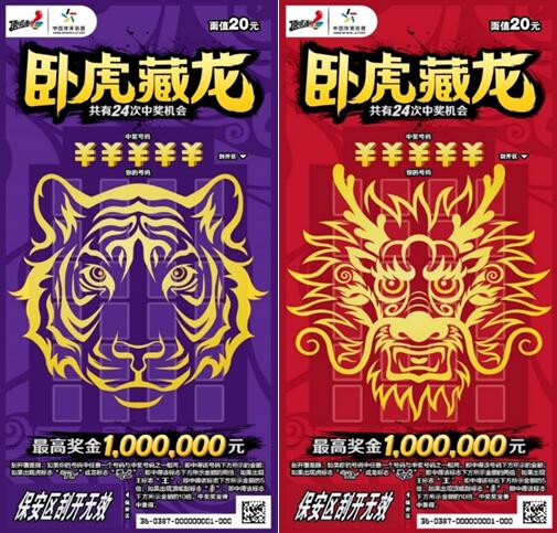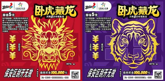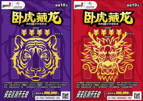 本次上市的“臥虎藏龍”主題即開套票,共有5元、10元、20元三種面值。票面設計色彩濃郁、霸氣美觀,“虎頭”、“龍頭”標識躍然于票面正中,“眼神”犀利且極富“挑戰”意味,寓意充滿自信,敢于挑戰最高獎金。