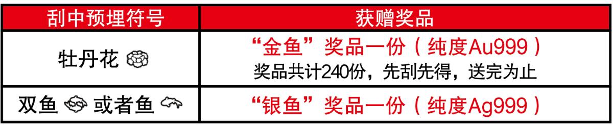 活動期間,彩民在我省任一體彩銷售網(wǎng)點購買30元面值“富貴有余”主題即開票,若單張彩票刮出符合獎勵條件的預埋符號,并經(jīng)兌獎設備(IVT或BCR等)完成掃描確認(促銷兌獎)且剪角處理后,即可獲贈精美獎品一份,詳見下表: