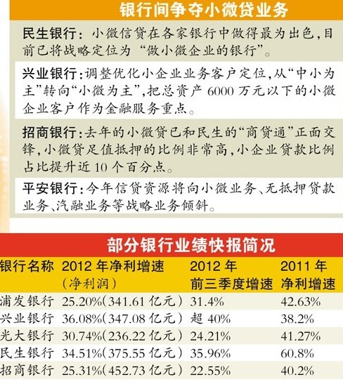 這也就意味著在同業業務上較為出色的興業銀行,今年將加入與各家銀行爭奪小微企業信貸的行列。興業銀行披露的數據顯示,2012年該行小企業客戶數全年增幅近40%