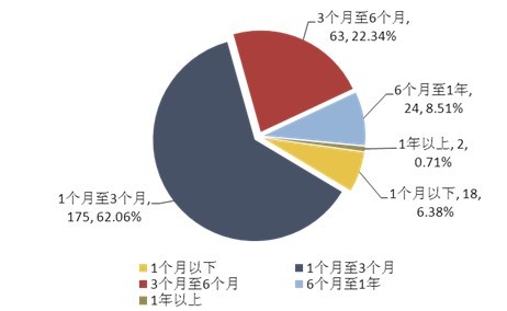 本周,1個月(含)以下期理財產品發行數為18款,較上期報告減少5款,平均預期收益率為3.46%,和上期報告持平;1個月至3個月(含)期理財產品發行數為175款,較上期報告減少84款,平均預期收益率為4.13%,較上期報告上升6個基點;3個月至6個月(含)期理財產品發行數為63款,較上期報告減少40款,平均預期收益率為4.36%,較上期報告上升9個基點;6個月至1年(含)期理財產品發行數為24款,較上期報告減少25款,平均預期收益率為4.15%,較上期報告下滑16個基點;1年以上期理財產品發行數為2款,較上期報告減少3款,平均預期收益率為4.93%,較上期報告上升8個基點。