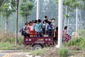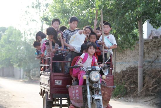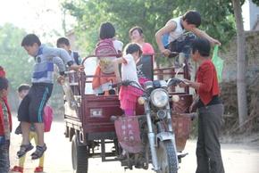 三輪摩托車開進鄭開大道南邊的一個村子停了下來。此時,我才發現真正在駕駛三輪摩托車的是一位中年婦女,那個貌似在開車的小女孩就坐在三輪摩托車的油箱上。為了看清道路,中年婦女不得不歪著腦袋開車。車子停下時,車上的孩子們紛紛跳下車向家中跑去。