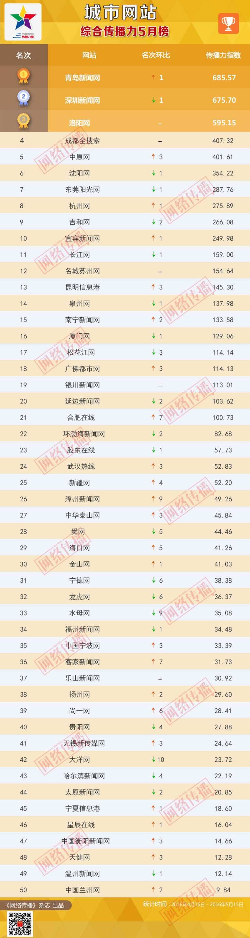 中央網(wǎng)信辦《網(wǎng)絡(luò)傳播》雜志傾力打造的“城市網(wǎng)站傳播力2016年5月榜”今日正式發(fā)布。榜單顯示,青島新聞網(wǎng)、深圳新聞網(wǎng)、洛陽(yáng)網(wǎng)位列綜合傳播力榜前三甲;青島新聞網(wǎng)、深圳新聞網(wǎng)、成都全搜索位居PC端傳播力榜前三名;兩微傳播力榜前三名分別是洛陽(yáng)網(wǎng)、中原網(wǎng)、成都全搜索。
