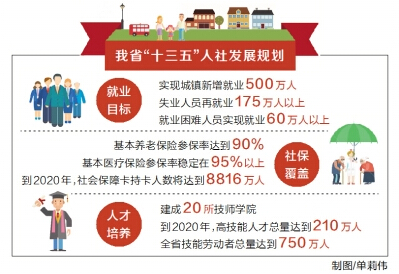 根據《規劃》,下一步,我省將落實完善更加積極的就業政策,統籌推進高校畢業生、農村轉移勞動力、城鎮困難人員、退役軍人等重點群體就業,同時提高創業服務能力,促進創新創業帶動就業,健全統一規范靈活的人力資源市場體系。“十三五”期間,實現城鎮新增就業500萬人,失業人員再就業175萬人以上,就業困難人員實現就業60萬人以上。