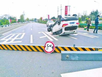 早上6時(shí)許,記者在現(xiàn)場看到,該處限高桿被撞斷后橫在路面上,斷桿的旁邊,一輛轎車四輪朝天地“躺”在路中間,將整個(gè)上橋口堵死,導(dǎo)致車輛無法上橋,只能走橋下,造成交通擁堵不堪。交警二大隊(duì)與中原區(qū)三官廟辦事處的巡防隊(duì)員,正在現(xiàn)場疏導(dǎo)交通。