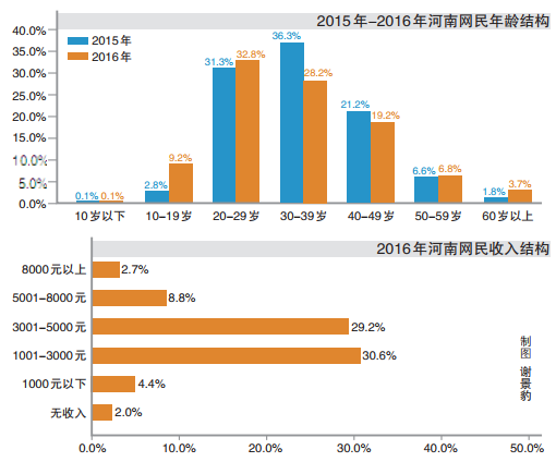 另一項統計數據顯示,河南網民的“主力軍”還需在收入層次上“加把勁兒”,去年河南網民收入結構顯示,排名第一,占比30.6%的網民,月均收入還停留在1001-3000元的水平。