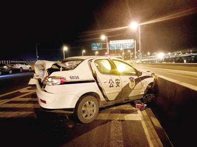 23時50分許,一輛由南向北疾馳而來的晉A號黑色邁騰,撞開路中反光錐后,直接沖撞向警車尾部,正在警車旁勘查現場的馬衛東受到沖擊,當即倒在橋面上,警車被撞擊后車頭右側撞上匝道口水泥墩,前保險杠碎裂嚴重,后備廂變形崩起,右側車門變形難以關閉。