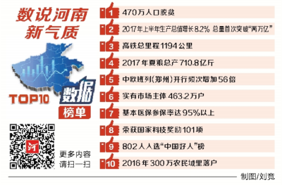 根據網友投票結果和專家評審意見,這份令人矚目的榜單最終揭開神秘“面紗”。其中,470萬人口脫貧、2017年上半年生產總值增長8.2%總量首次突破“兩萬億”和高鐵總里程1194公里名列前三位,2017年夏糧總產710.8億斤、中歐班列(鄭州)開行頻次增加56倍、實有市場主體463.2萬戶、基本醫保參保率達95%以上、榮獲國家科技獎勵101項、802人入選“中國好人”榜、2016年300萬農民城里落戶等7個數據也榜上有名。