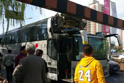 北京大巴車(chē)撞上限高桿 車(chē)頂凹陷無(wú)傷亡