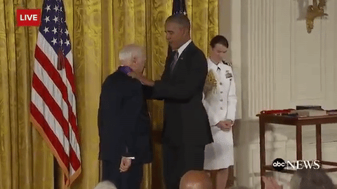 據報道,老藝術家Mel Brooks今天進白宮接受“National Medal of Arts”,奧巴馬往他脖子上掛獎章的時候,這個90歲的老頑童做勢要脫奧巴馬的褲子,給總統嚇了一趔趄。
