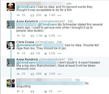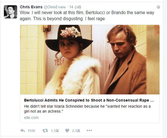 《美國(guó)隊(duì)長(zhǎng)》克里斯·埃文斯(Chris Evans)也表示:“天啊,我再也無(wú)法像過(guò)去那樣看待這部片子、貝托魯奇或白蘭度,這已經(jīng)超越了惡心,我覺(jué)得很憤怒!”他的發(fā)文也引來(lái)許多網(wǎng)友認(rèn)同,連《歌喉贊》女主角安娜·肯德里克(Anna Kendrick)也在底下回應(yīng)表示,“施耐德女士之前曾在訪談中說(shuō)過(guò),‘我曾提起過(guò)這件事情,聽(tīng)的人(男人們)還翻白眼’。”