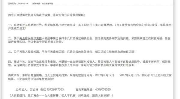 上述公告發布之后引起了投資者和員工的強烈不滿,于是來財街官網數小時后又發布了聲明,強調“來財街并無跑路的行為,相關結算都已經處理完成,員工12月份工資已足額發放,1月工資按照合約會在2月15日發放,年終獎也并無拖欠員工!”
