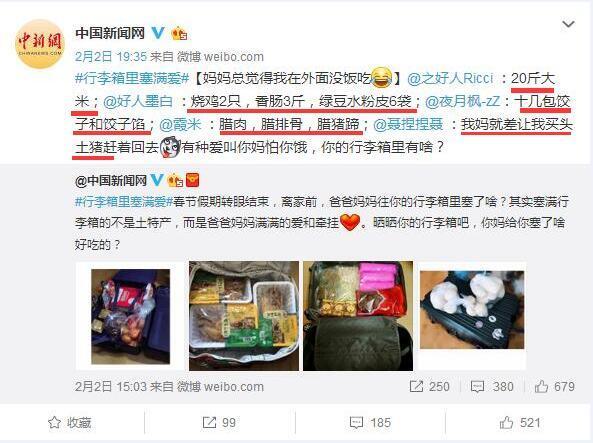 年,就這么過完了……@中國新聞網在微博上發起了一個過年返程催淚話題#行李箱里塞滿愛#,離家前,爸爸媽媽往你行李箱里都塞了啥?看了網友的回復,有饅頭、大米、土雞蛋、餃子餡、燒雞……簡直笑到飆淚。其實,塞滿行李箱的不是土特產、不是洋氣貨,是愛、是滿滿的牽掛與不舍!