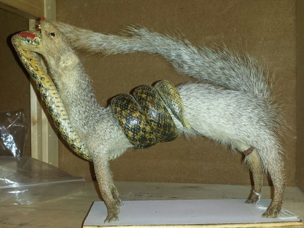 近日,社交媒體上瘋傳一組讓人看了惡夢連連的博物館展覽照,照片中有有恐怖的玩偶、繪畫作品和怪異的模型等。作品之一是,一條蛇和貓鼬緊緊纏在一起,表現的是蛇和貓鼬生死斗爭的最后時刻,最終貓鼬半吞蛇以示勝利。
