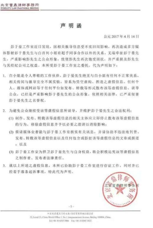 “經紀團隊已多次澄清彭于晏與白百何并無同事以外關系,此次仍遭扭曲報道,我們對此表示遺憾與不滿”。“工作室今以律師函再次正式澄清,懇請媒體相關從業人員了解。未來,我們不再容忍惡意引用錯誤傳聞的行為”。