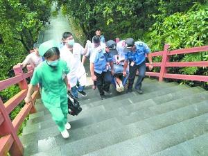 盧先生繼續攙扶著妻子往山下走。當他們走到離山腳還有900米時,遇到了兩名前來施救的輔警,兩人在兩名輔警的攙扶下,繼續慢慢向山下走去。走到離山腳約600米距離時,120急救人員、景區工作人員及兩名輔警也趕來了。醫護人員對他們進行了檢查和包扎后把王女士抬上擔架。王女士一邊輸液一邊被抬下山。40分鐘后,終于到達山下,王女士被送往醫院救治。