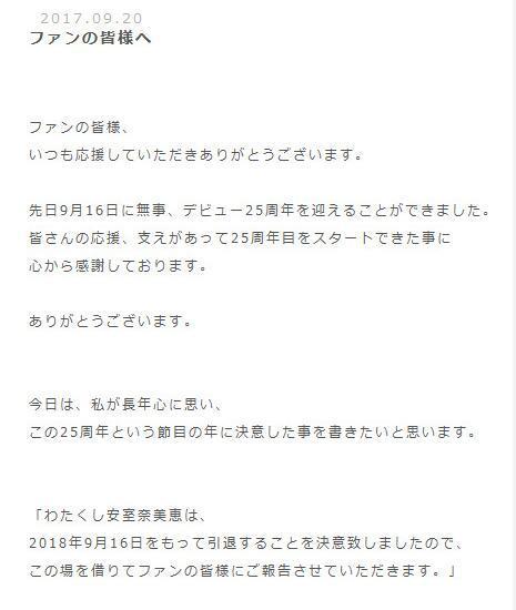 我“安室奈美惠”想借此機會告訴我所有的粉絲,我決定于明年2018年9月16日正式隱退。