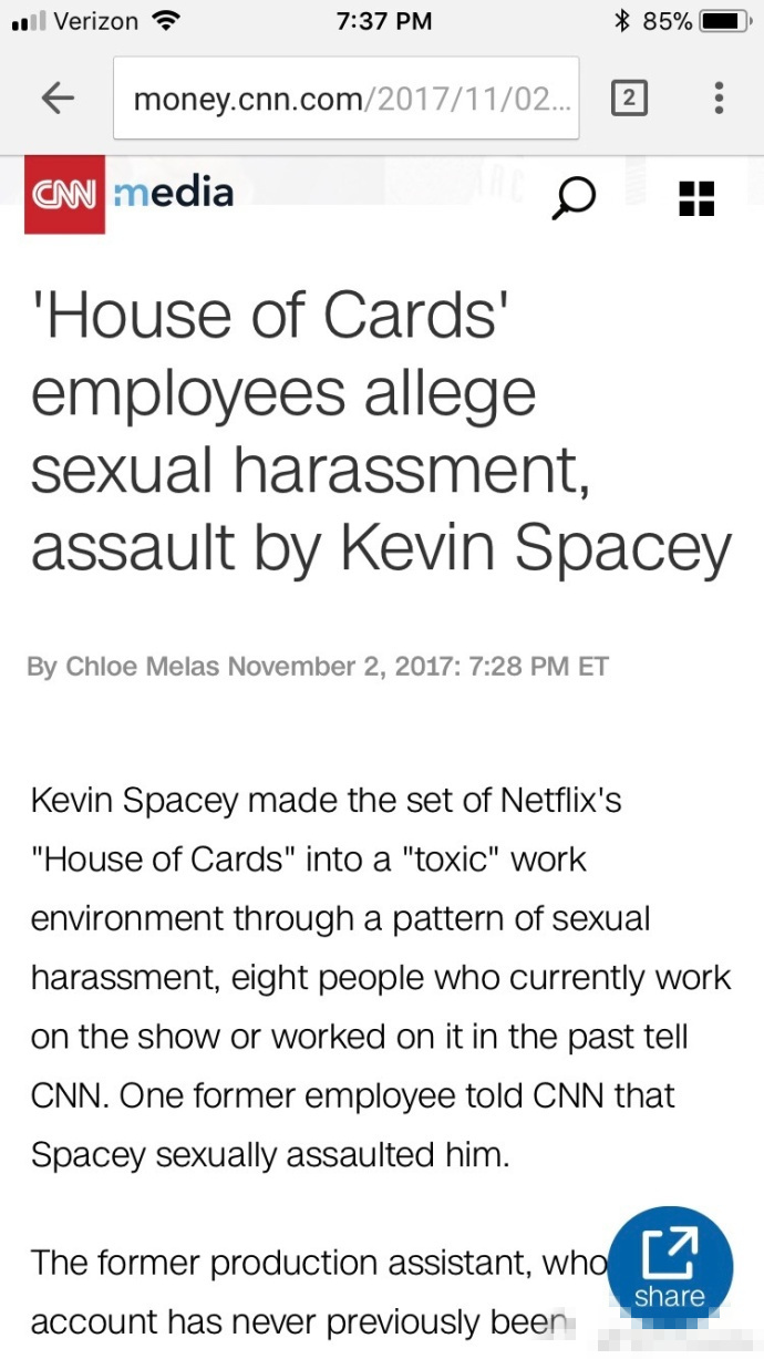 從砍劇到第六季停拍,凱文·史派西性騷擾事件給美劇《紙牌屋》帶來了不小的風波。而據CNN今日報道稱,目前有8名《紙牌屋》現員工及前員工向他們控訴凱文·史派西曾對自己實施性騷擾,其中一名甚至聲稱史派西性侵了他。這8名員工由于害怕講出這件事會對自己的事業產生影響,采用了匿名的方式向CNN揭發這件事情,他們稱史派西已經是個慣犯,經常對年輕男性有性騷擾行為,包括在對方不情愿的情況下觸摸、說一些粗魯的言語等。